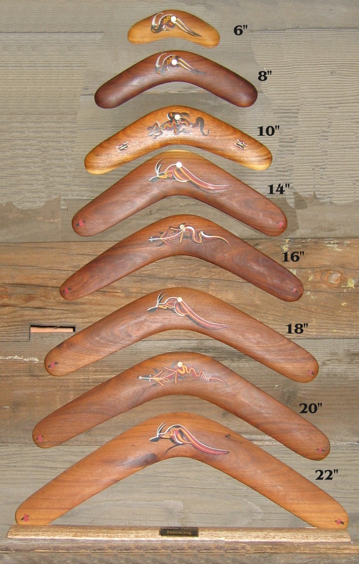 Standard boomerangs![]() Hardwood boomerangs, hand painted by Aboriginal artists Bigger image (234K) |